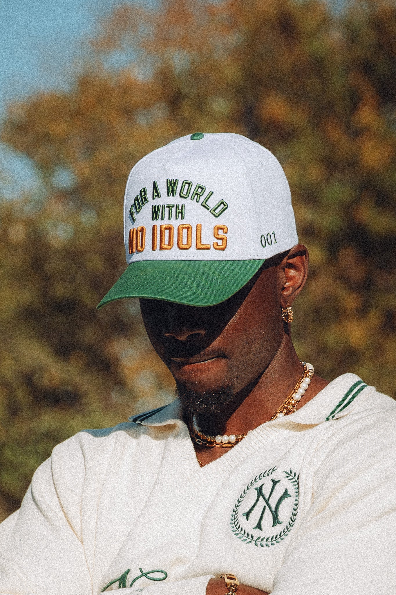 The For a World Snapback Cap in White & Green from Collection 001 is constructed in a high-crown, five-panel cotton twill with oversized puff embroidery at the front. It features a contrast visor, a half-structured front panel, and an adjustable snapback closure.