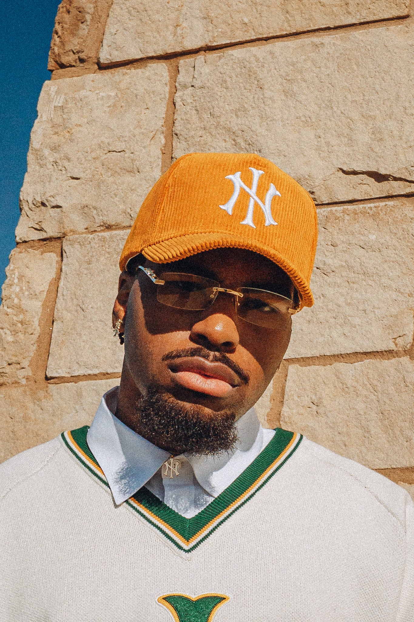The NI Corduroy Snapback Cap in Gold from Collection 001 is constructed from a cotton-poly corduroy with a high-crown, five-panel shape. It features oversized puff-embroidered NI detailing at the front and an adjustable snapback closure.