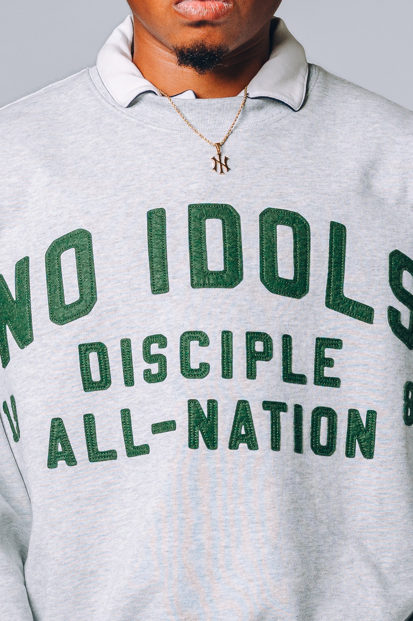 The All-Nation Crewneck from Collection 001 is constructed from a 480 GSM heather grey French terry with a drop shoulder and boxy silhouette. It features a thick, raised single-stitch felt appliqué embroidery across the front and ribbed trims throughout. Made from 100% Cotton.
